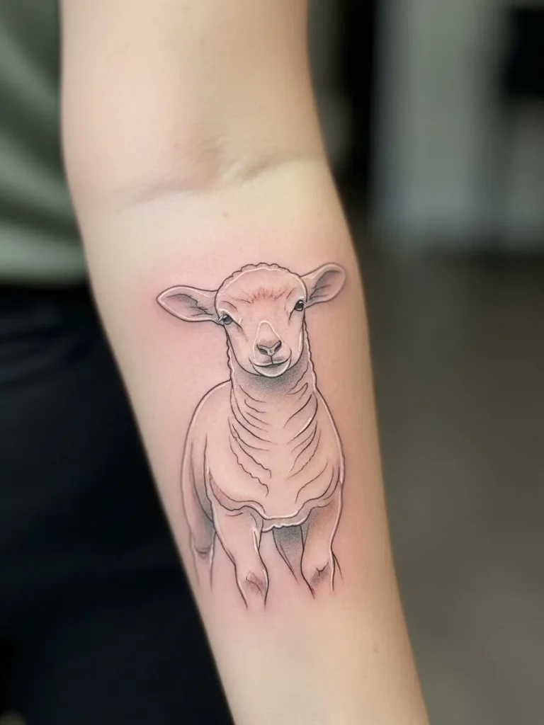 Placed on the inner forearm, this tattoo shows a lamb illustrated in fine lines with soft beige and light brown shading. The medium size gives the design presence, while the clean style keeps it peaceful and modern.
