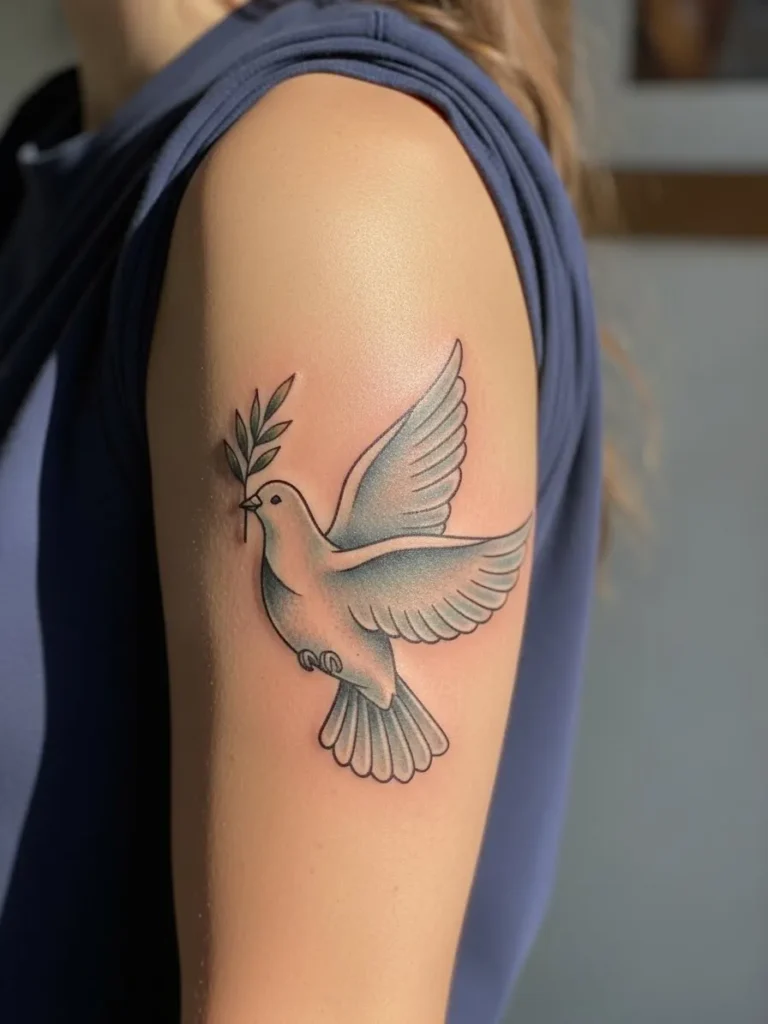 This tattoo sits on the outer upper arm and features a dove holding an olive branch, done in soft neutral tones with subtle shading. The wings are slightly spread, giving the design movement while keeping the overall look clean and balanced.