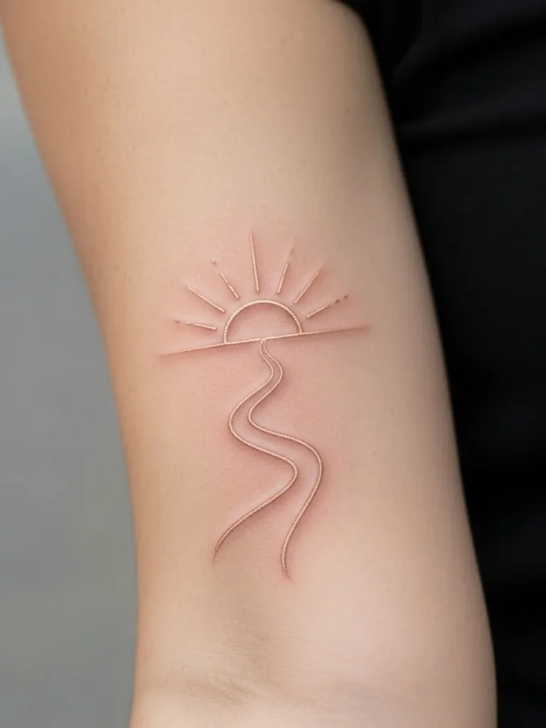 This tattoo is placed on the inner forearm and features a flowing path line rising toward a soft sunburst at the top. The fine line style keeps it minimal, while gentle blush and warm beige tones add a fresh and modern feel. The size is small to medium, making it subtle but meaningful on the arm.