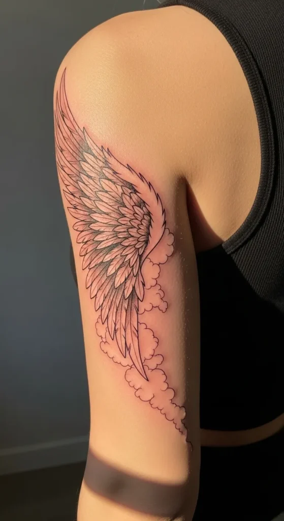 In my opinion, the way the clouds anchor the wing makes the whole design feel like it is caught in motion. It reminds me of the idea of freedom or having a guardian watching over you. Most of us want something that feels both powerful and soft at the same time, and this hits that sweet spot effortlessly. It is the kind of art that makes me want to wear sleeveless tops all year round just to show it off to the world.