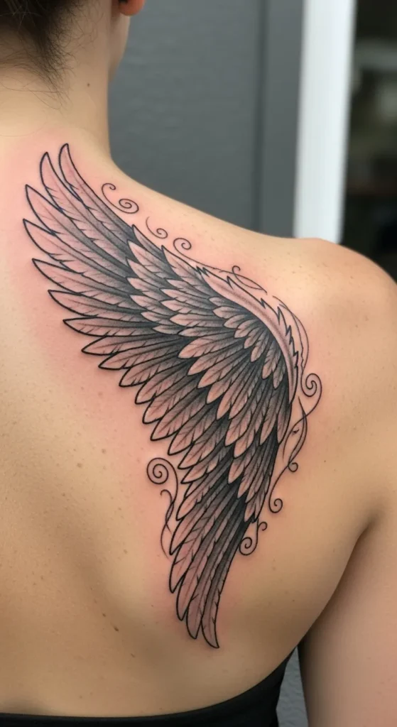 This tattoo features a single angel wing that gracefully spans the upper right shoulder blade and stretches down toward the mid back. The style leans into illustrative blackwork with fine line accents that give the feathers a soft and airy texture. While the main body of the wing uses smooth grey shading to create depth, the edges are finished with playful black swirls that dance around the perimeter. It is a medium-sized piece that perfectly follows the natural curve of the body, using nothing but black and grey ink to achieve a look that feels both grounded and ethereal.