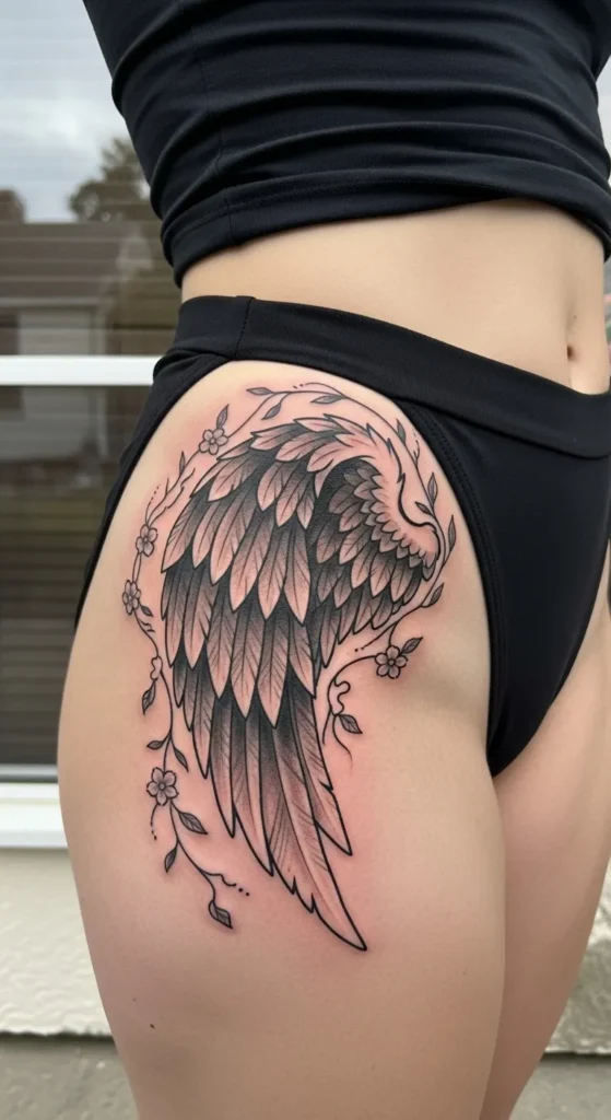 This tattoo features a single, bold angel wing placed perfectly on the outer hip and upper thigh. The style blends illustrative linework with soft black and grey shading to create depth within the feathers. Measuring as a medium to large piece, the wing is framed by a delicate vine of tiny flowers and leaves that curve naturally with the body. While the ink is primarily black, the contrast between the dark feathered tips and the open skin breaks makes the whole design pop against the leg.