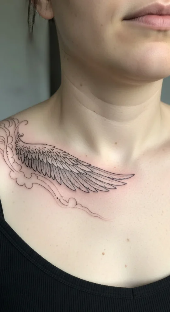 I have always felt that the collarbone is one of the most elegant spots for a tattoo because it frames the face so well. There is something really powerful about having a wing right over your heart space. It feels like a little reminder of protection or personal freedom that you can catch a glimpse of in the mirror every morning. The way the lines are so thin and crisp makes it feel more like jewelry than heavy ink, which is exactly the vibe if you want something that feels both bold and feminine at the same time.