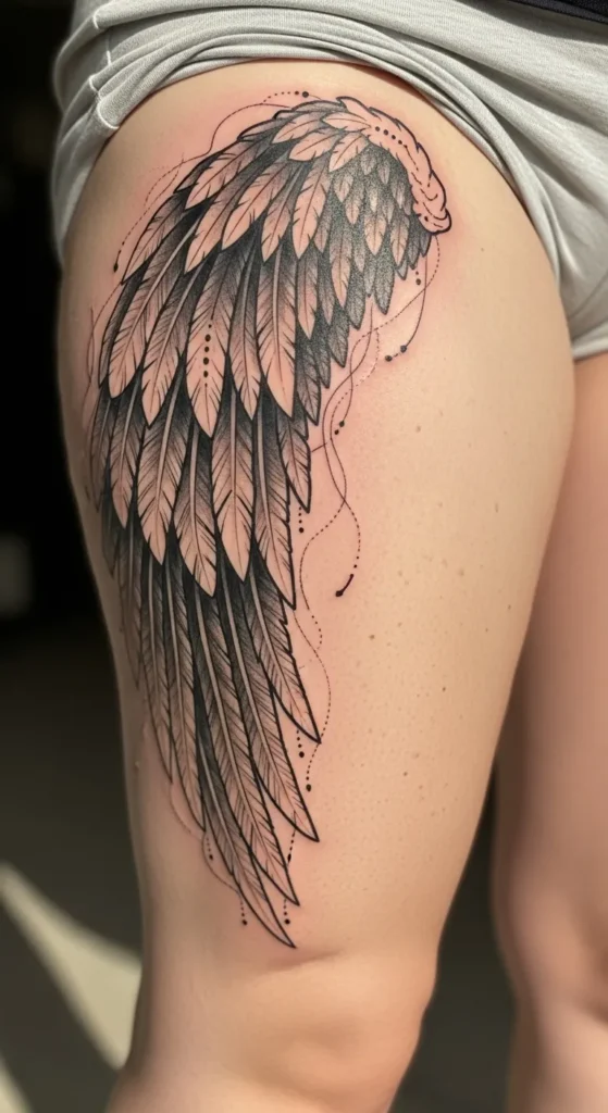 This large-scale thigh tattoo captures a single angel wing in incredible detail using a mix of bold blackwork and soft grey shading. The design flows naturally with the curve of the upper leg, stretching from the hip down toward the knee. Each feather is intricately lined, creating a layered texture that looks almost touchable. To give the piece a more modern and feminine vibe, the artist added delicate fine line trails and tiny black dots that dance around the edges of the wing, making it feel like it is caught in a gentle breeze.