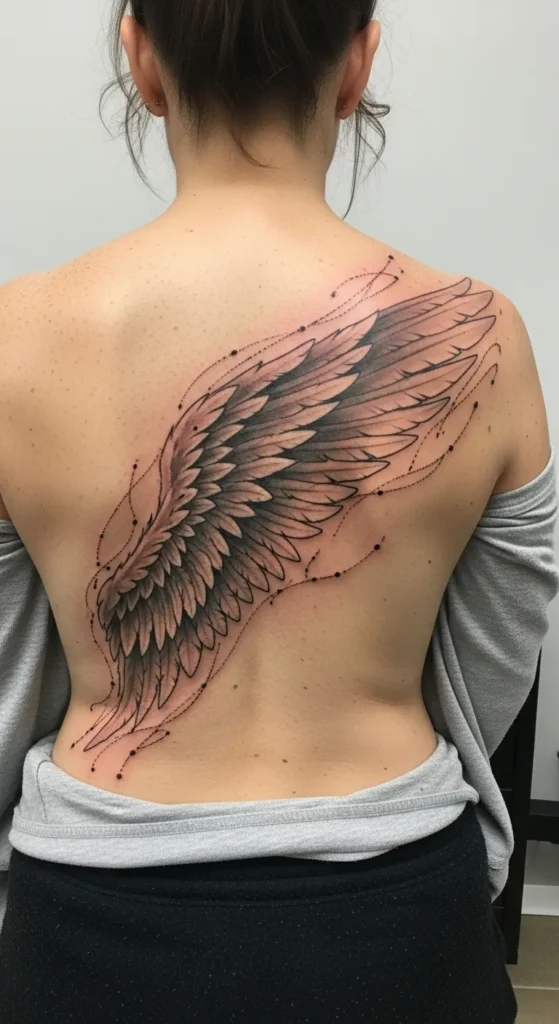 This large back piece features a single, detailed angel wing that stretches diagonally across the shoulder blade down to the lower back. The style leans into illustrative realism with soft gray shading and crisp black outlines that give each feather a sense of weight and texture. It is a bold size but maintains a feminine feel thanks to the dainty dotted lines and tiny ornamental orbs that swirl around the edges. The monochromatic palette keeps it classic, while the negative space between the feathers adds a beautiful lightness to the overall composition.