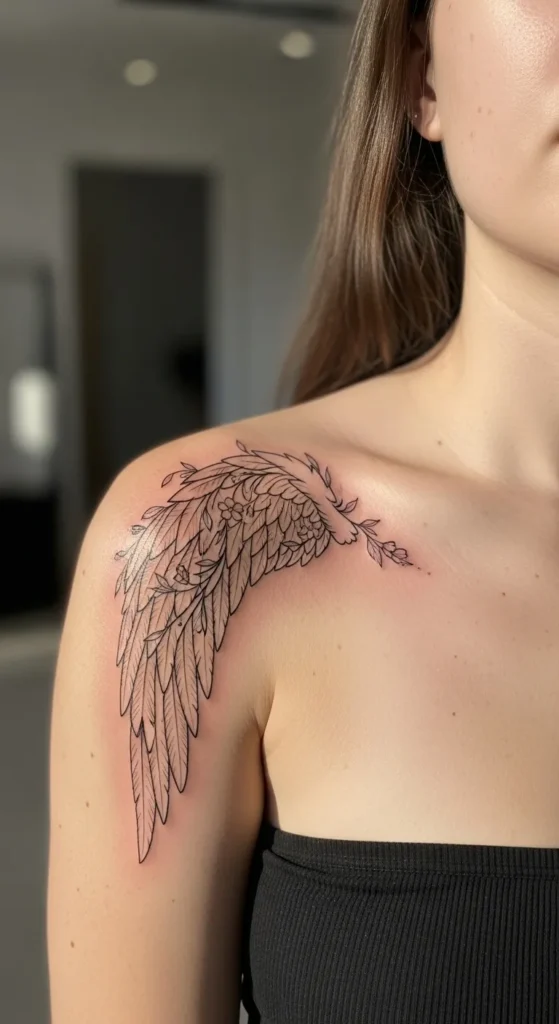 This fine line piece beautifully blends the organic texture of a bird wing with soft floral elements. Positioned to drape naturally from the collarbone down over the outer shoulder, the tattoo features elongated feathers that transition into delicate vines and tiny blossoms at the top. The linework is incredibly crisp and airy, using varying weights of black ink to create depth without any heavy shading. Its size is substantial enough to make a statement, but the open design keeps it from feeling overwhelming on the skin.