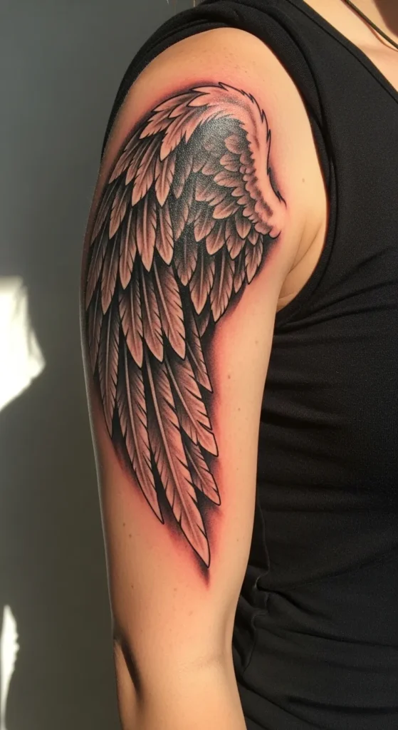 This stunning upper arm piece features a single, sweeping angel wing that follows the natural curve of the shoulder. The style leans into illustrative realism with heavy black shading and high contrast to make the feathers pop against the skin. It is a medium-sized tattoo that uses a sophisticated grayscale palette, but look closely, and you will see a soft red glow around the edges. This subtle halo effect gives the whole design a warm and mystical energy that sets it apart from standard black and grey work.