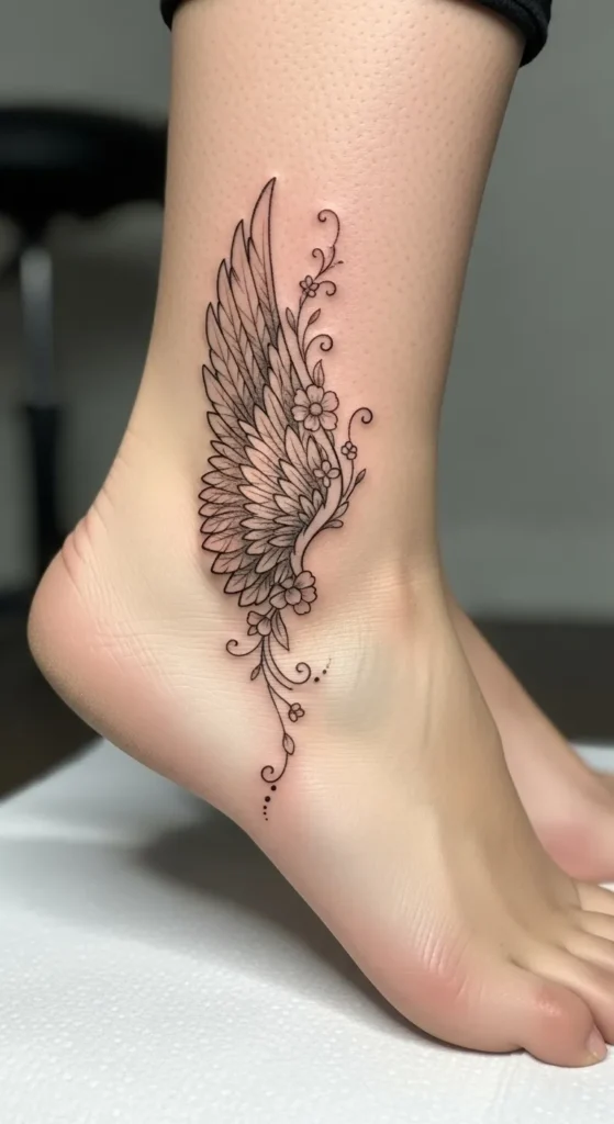 This gorgeous fine-line tattoo wraps gracefully around the outer ankle and extends slightly down toward the foot. The design features a singular, feathered angel wing that transitions into delicate floral vines and tiny blossoms. It is rendered entirely in soft black and grey ink with incredibly precise linework that gives it a light and airy feel. The size is perfect for the area, following the natural curve of the leg to create a sense of movement that feels both feminine and sophisticated.