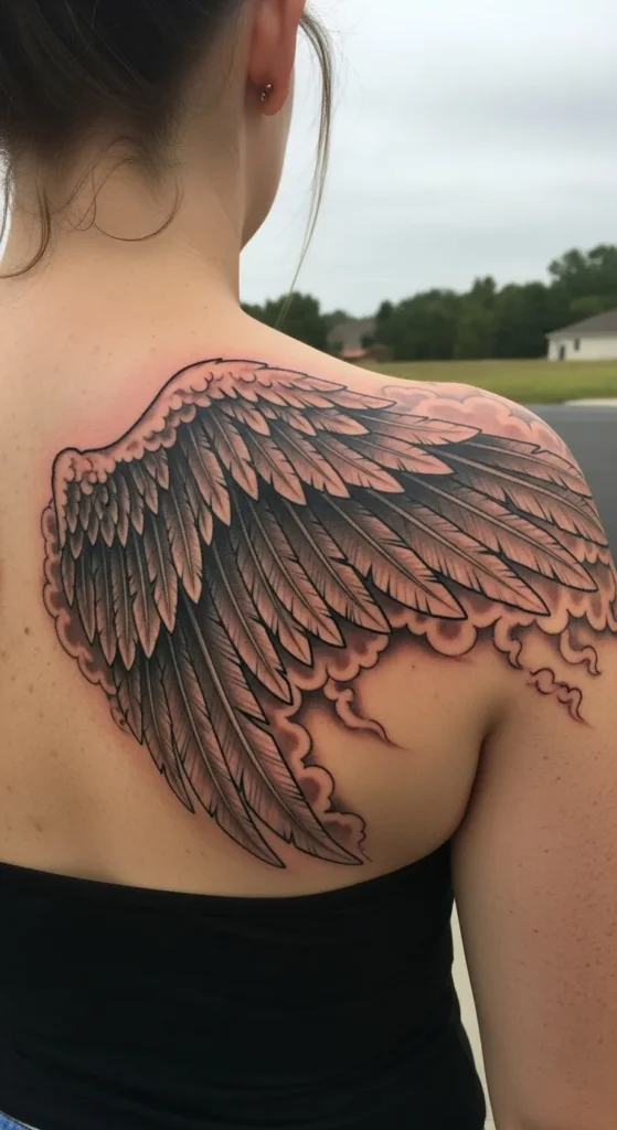 This stunning piece stretches across the shoulder blade and sweeps over the top of the shoulder in a bold yet feminine display. The tattoo features a single large angel wing rendered in a detailed black and grey illustrative style. Each feather is meticulously defined with fine lines and deep shading to create a sense of layered texture and realistic depth. Surrounding the wing are soft, stylized clouds with gentle reddish undertones that add a touch of warmth and help the design flow naturally with the curves of the body. The size is substantial and makes a real statement without losing its graceful feel.