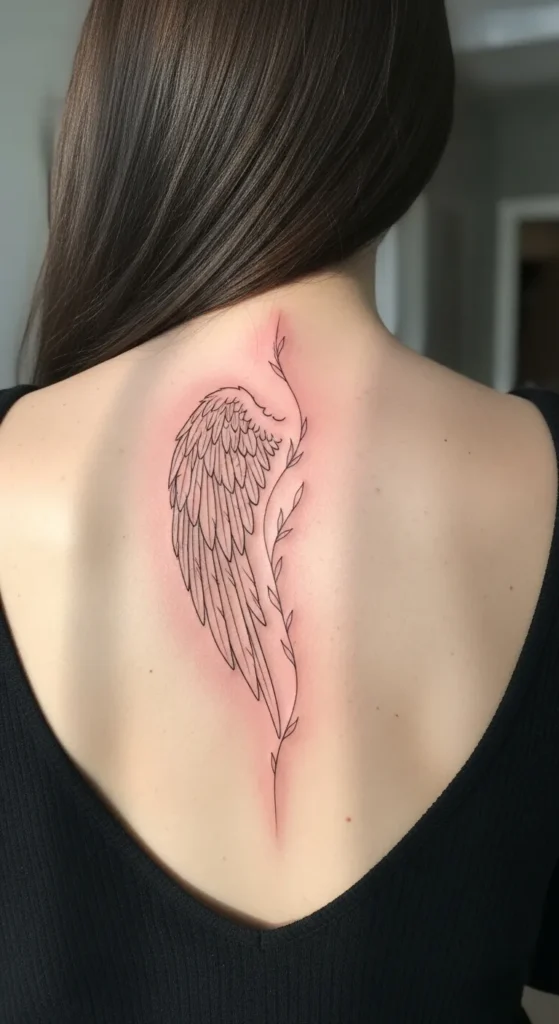 I really feel like this design captures that perfect balance between nature and spirituality. Having the wing paired with a vine makes the whole look feel grounded and organic rather than just a standard celestial symbol. It reminds me of personal growth and finding your own strength, and the way it follows the natural line of the back is just so flattering. It is the kind of art that feels like it was meant to be there all along, almost like a hidden part of your own anatomy.