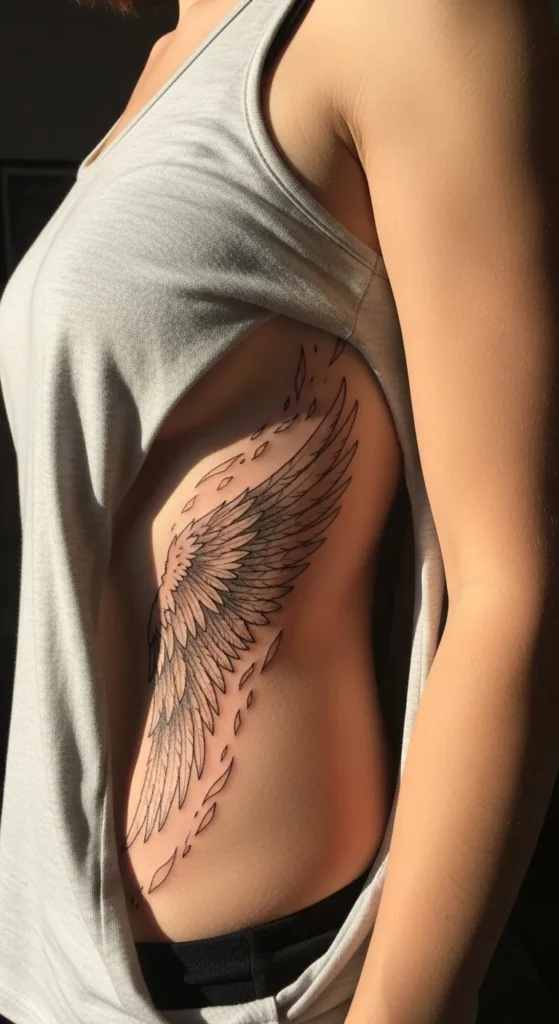 I am a huge fan of how this piece wraps around the torso because it feels like it was meant to be there. The way those tiny floating feathers drift away from the main wing makes it look like the angel is actually in flight, which is such a poetic touch. For me, the rib cage is such a powerful spot for a wing because it feels protective and close to your heart. It is the perfect choice if you want something that feels both bold and incredibly feminine without being too heavy or dark.