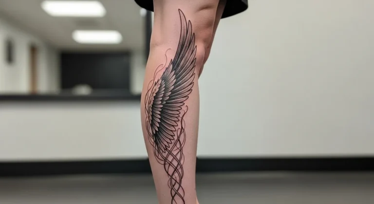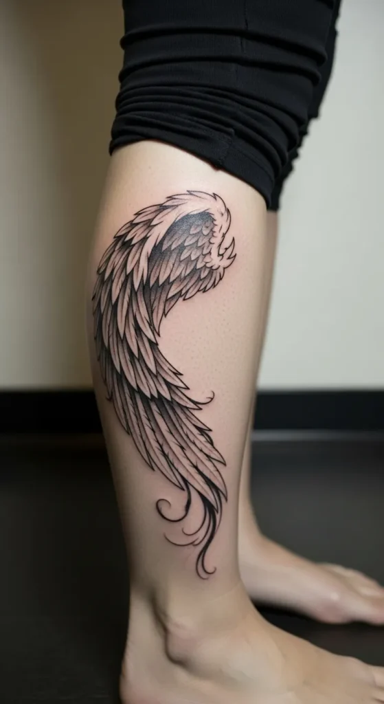 I am genuinely impressed by how this design manages to be both large and incredibly feminine at the same time. The addition of those little decorative swirls at the base is a genius touch because it softens the transition from the leg to the foot. It reminds me of the classic idea of Hermes or an urban angel, which is such a cool vibe for a modern woman. I find the detail in the plumage so grounding and the flowing lines so freeing, which is exactly the kind of balance many of us look for in a meaningful tattoo.