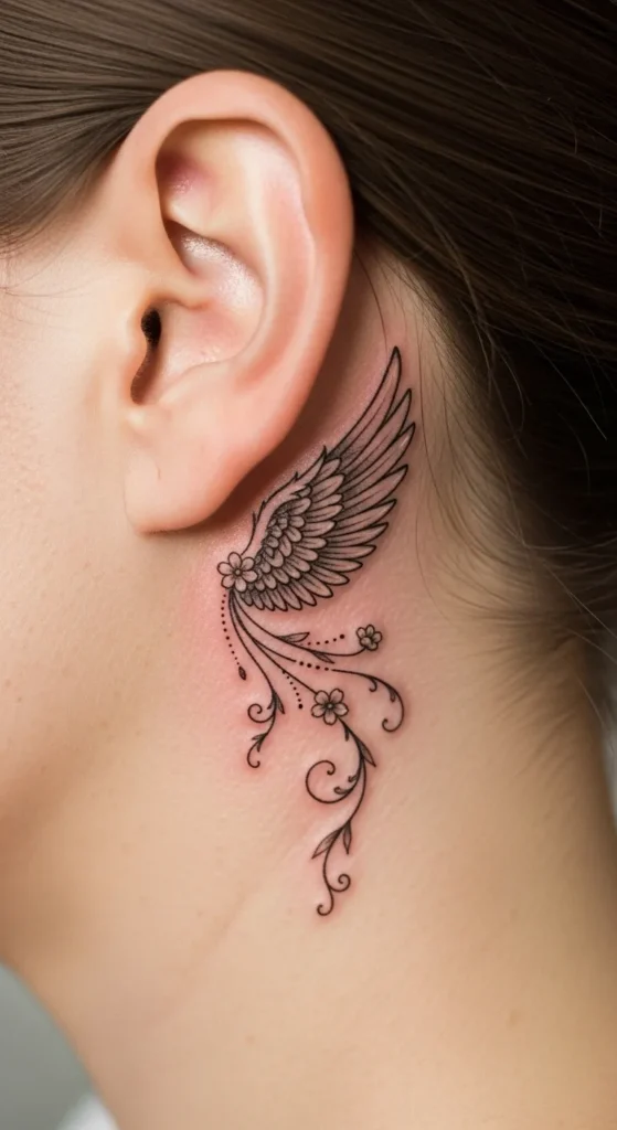 This behind-the-ear tattoo features a single angel wing that flows seamlessly into a delicate trail of vines and tiny blossoms. The style leans heavily into fine line work with soft grey shading that gives the feathers a light and airy feel. It is a small- to medium-sized piece that follows the natural curve of the neck, using only black and grey ink to maintain a clean and sophisticated look. The addition of the swirling floral elements at the base of the wing adds a feminine touch that makes the whole design feel like it is dancing right off the skin.