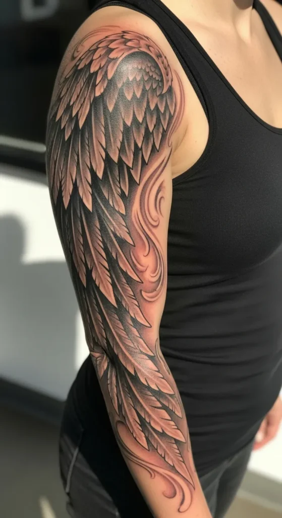 I find that the way this wing drapes over the natural curves of the arm makes it feel like a part of the body rather than just a drawing on top of it. It has such a powerful and protective vibe while still staying feminine and graceful through those wispy details at the bottom. If you want something that makes a bold statement but keeps a sophisticated edge, then this full-sleeve approach is definitely the way to go. It reminds me of a modern-day Valkyrie, and I can’t get over how the shading gives it so much depth and life.