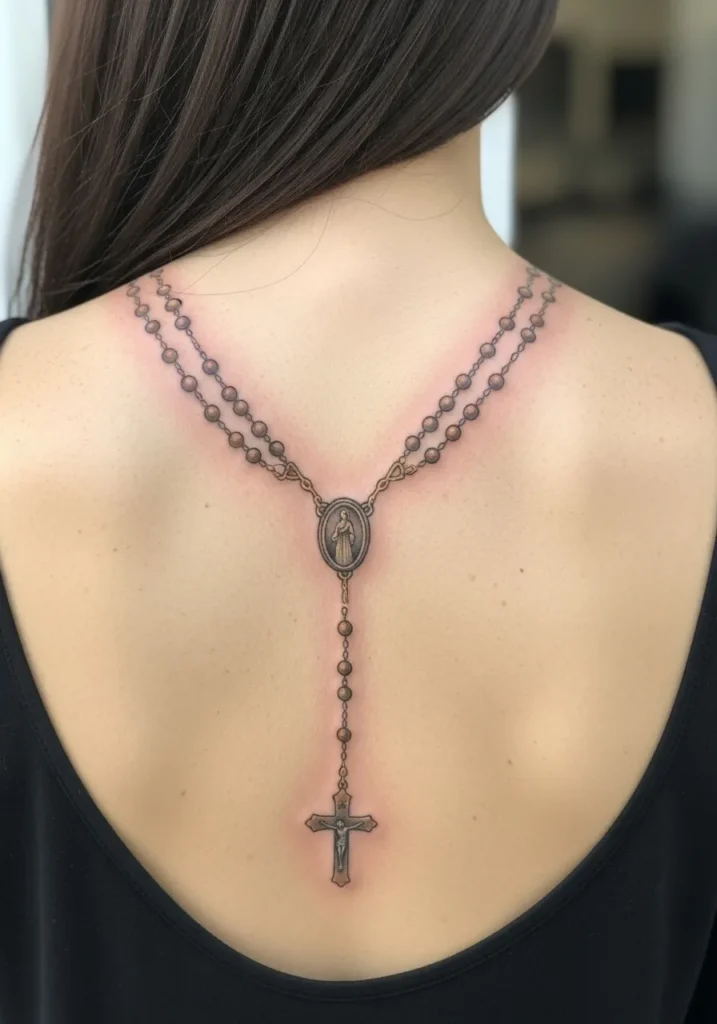 This tattoo features a rosary designed like a necklace resting across the upper back, flowing down the spine with evenly spaced beads in muted brown tones. The cross hangs centered and balanced, following the natural line of the back. The size feels graceful and intentional.