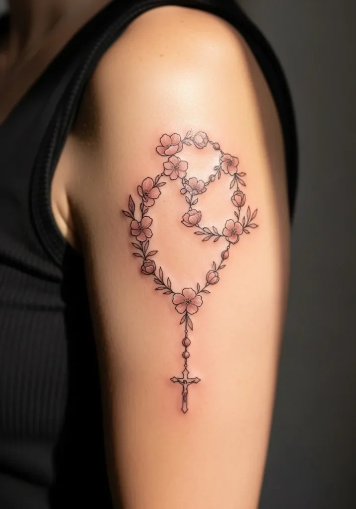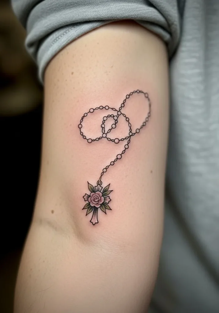This tattoo features a rosary loop on the upper arm, accented with small floral details in soft pink and green tones. The beads are done in fine line style, and the cross rests naturally below the loop. The added flowers bring a soft artistic touch.