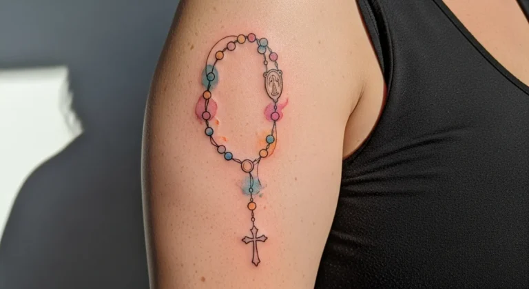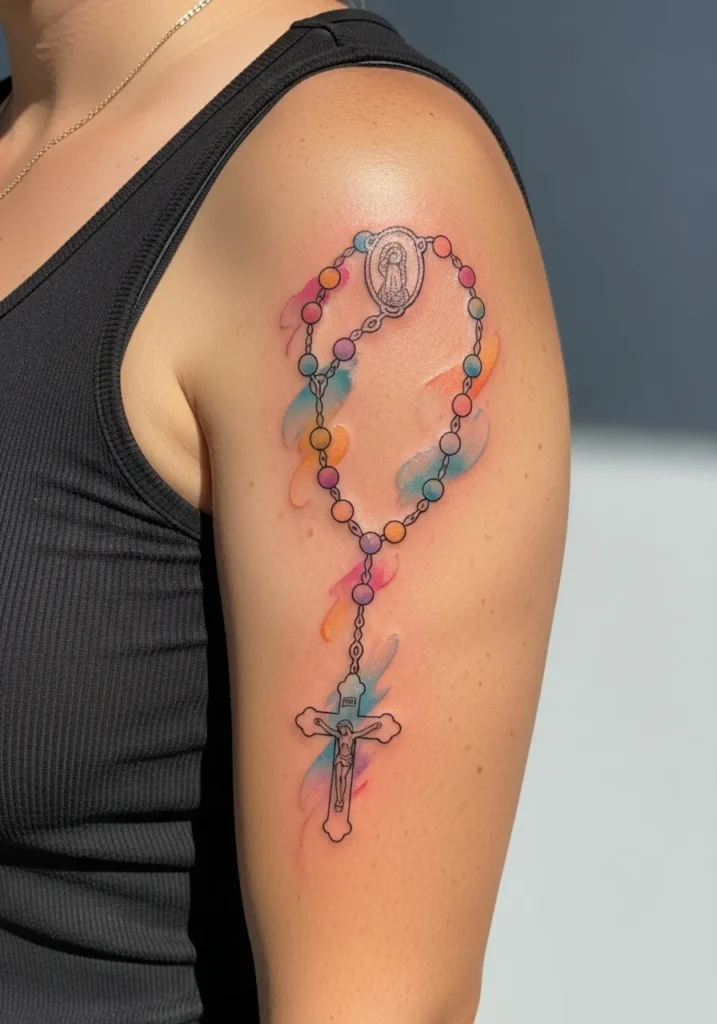 This tattoo shows a rosary on the upper arm with subtle color accents woven into the beads, using soft blues and warm neutrals. The fine line work keeps it elegant, while the color adds depth and personality. The size feels balanced and eye catching.