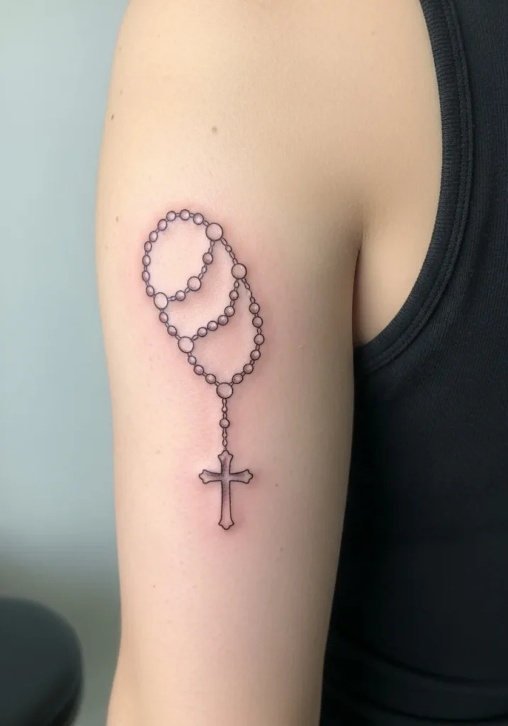This tattoo shows a small rosary loop placed on the upper arm, done in fine line style with soft blush and brown coloring. The beads are delicate and evenly spaced, with a simple cross hanging below. The placement keeps it visible without being overpowering.
