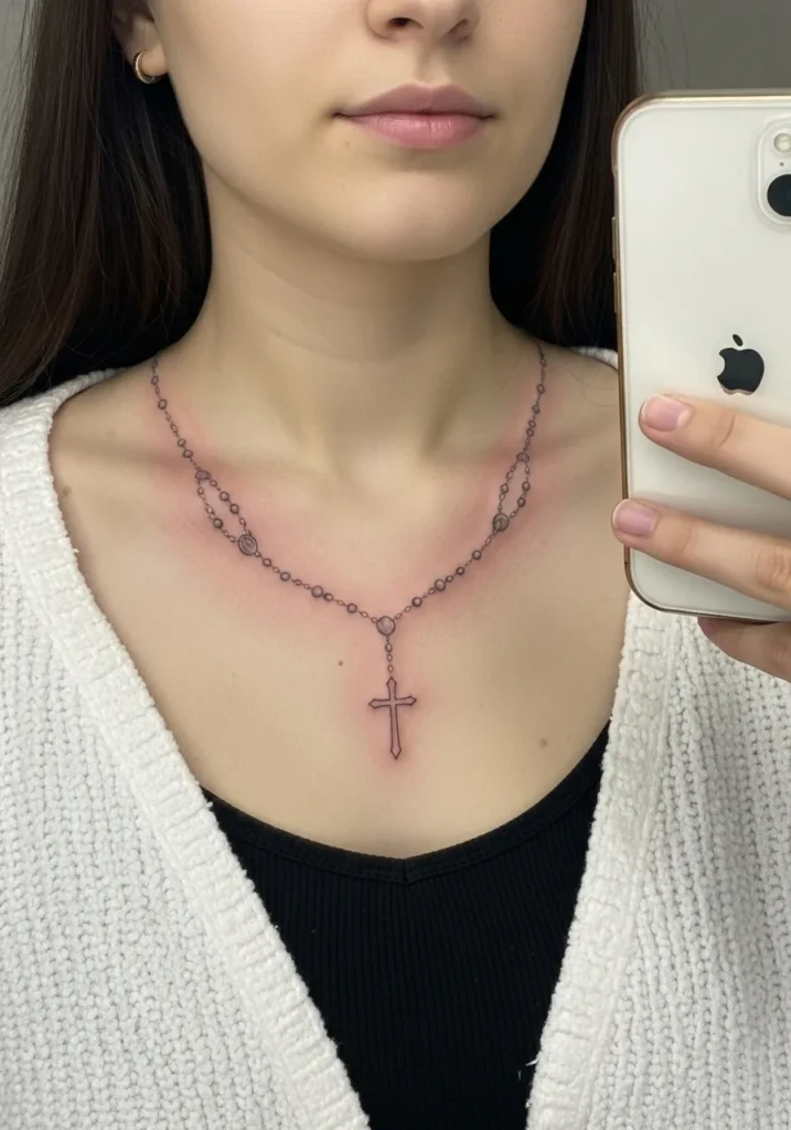 This tattoo features a rosary designed like a necklace resting across the collarbone, done in fine line style with soft brown and muted rose tones. The beads follow the natural curve of the neckline, and the cross hangs gently at the center of the chest. The size feels elegant and balanced, almost like a real piece of jewelry.