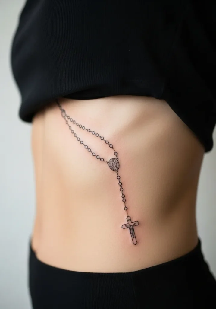 This tattoo shows a rosary flowing along the side of the ribcage, created with fine line beads in warm neutral tones. The chain follows the body naturally, with the cross resting lower for a graceful vertical effect. The size gives it presence while still feeling refined.