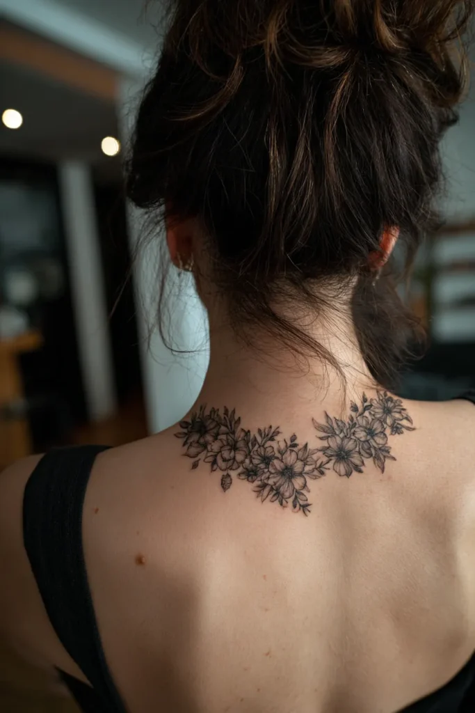 Placed along the upper spine just below the neck, this tattoo features a flowing line of scripture framed by delicate floral elements. The flowers are fine line and evenly spaced, creating a soft crown effect across the back while the text blends seamlessly into the design. The ink is light and balanced, with no harsh contrasts, allowing the tattoo to move naturally with the body. Its medium size makes it noticeable without feeling overpowering.