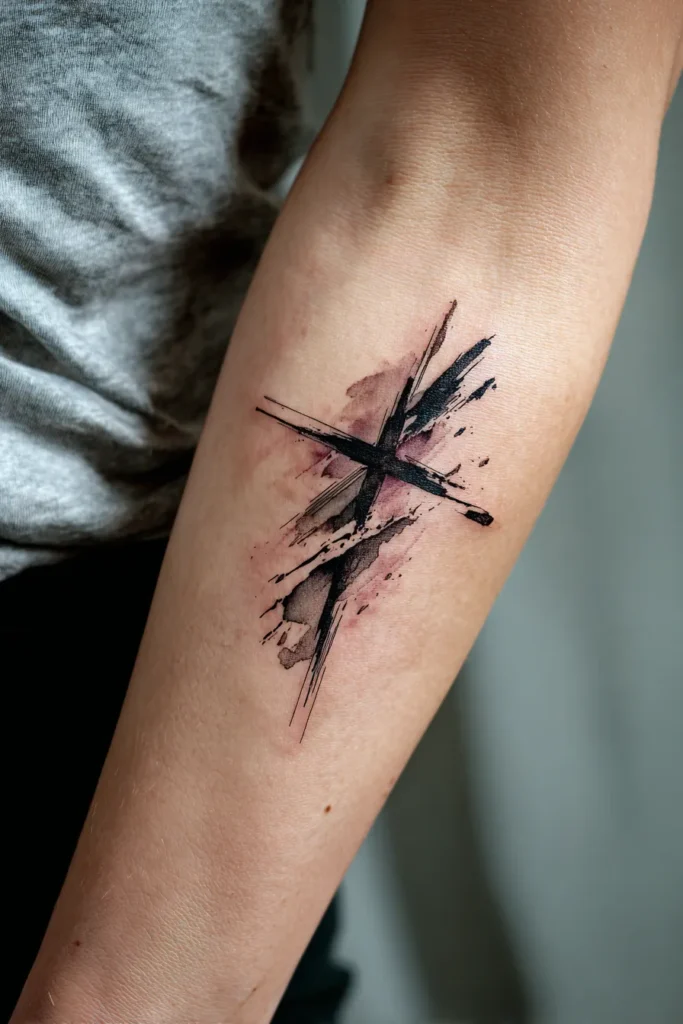 This tattoo is placed along the inner forearm and features an expressive cross created with loose brushstroke style lines. The design blends deep black ink with soft muted watercolor tones that lightly bleed into the skin for an artistic finish. Its medium size gives it presence without feeling heavy and the slightly imperfect strokes add a raw emotional quality.