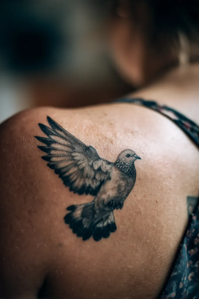 This tattoo sits beautifully on the upper shoulder and shows a realistic dove in mid flight with its wings fully open. The shading is soft and detailed giving the feathers depth while still keeping the overall look calm and natural. Its medium size fills the space nicely without overpowering the shoulder.
