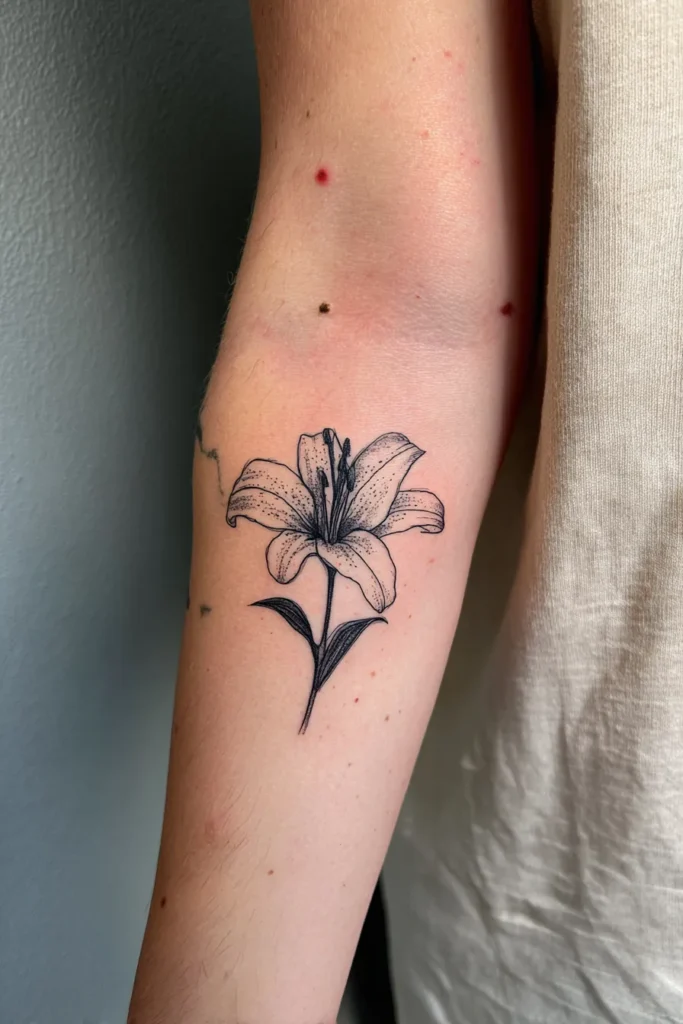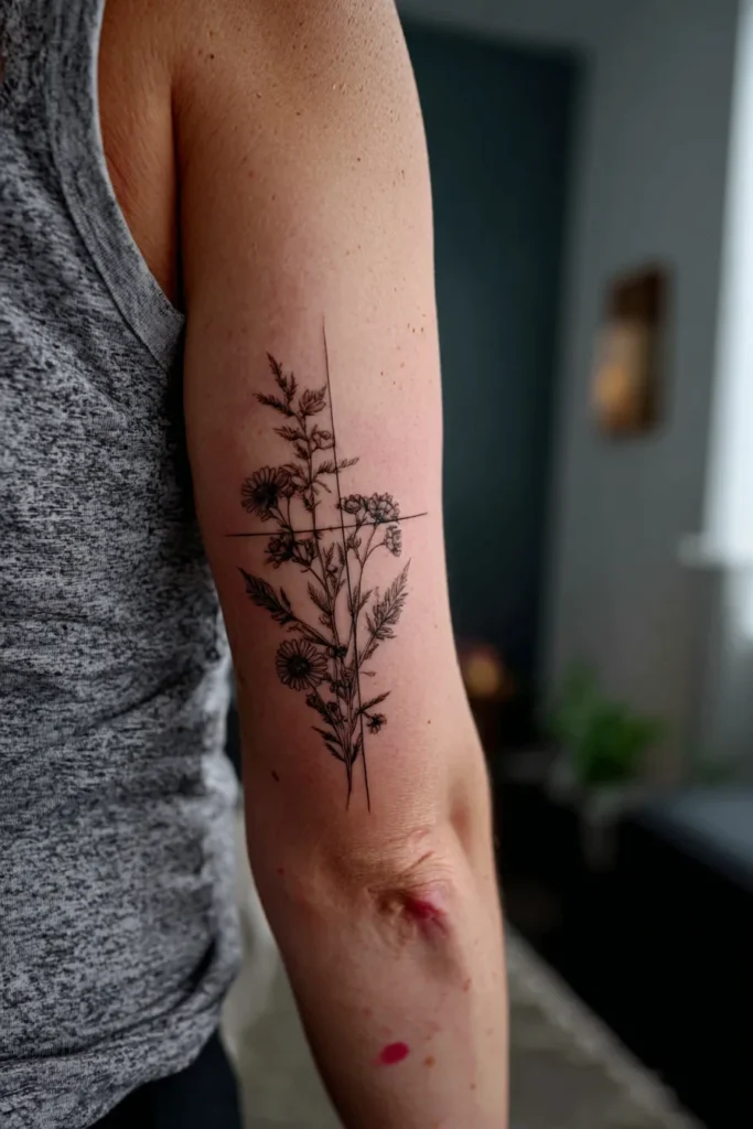 This tattoo runs vertically along the outer arm and features a delicate wildflower stem paired with fine script woven subtly into the design. The linework is thin and airy, with small leaves and petals that feel natural rather than overly polished. The size is medium and elongated, which makes it flow beautifully with the arm’s shape. Everything about it feels light and organic, from the spacing to the soft ink saturation.