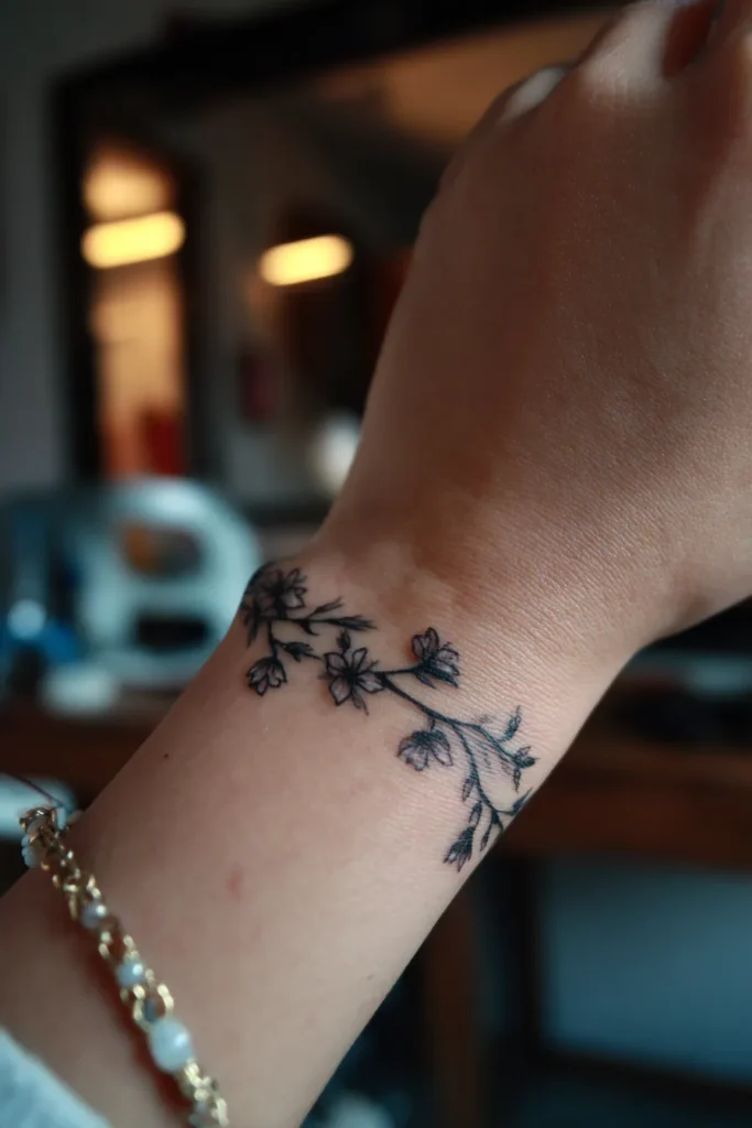 This tattoo wraps gently around the wrist like a loose bracelet, combining tiny floral details with flowing script. The flowers are small and evenly spaced, keeping the design airy and balanced, while the lettering stays thin and graceful. The size is subtle, making it perfect for someone who wants something meaningful but understated. The placement gives it a natural jewelry like effect that feels effortless.