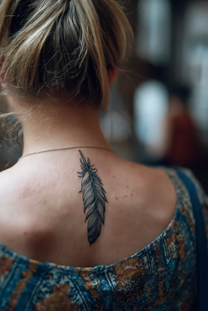 Placed neatly along the upper back near the spine, this tattoo features a single feather with fine script incorporated into its shape. The feather is slender and softly detailed, with gentle shading that keeps it light and natural. The size is medium but discreet, sitting perfectly between visibility and privacy. The overall style feels calm and intentional, never overpowering.