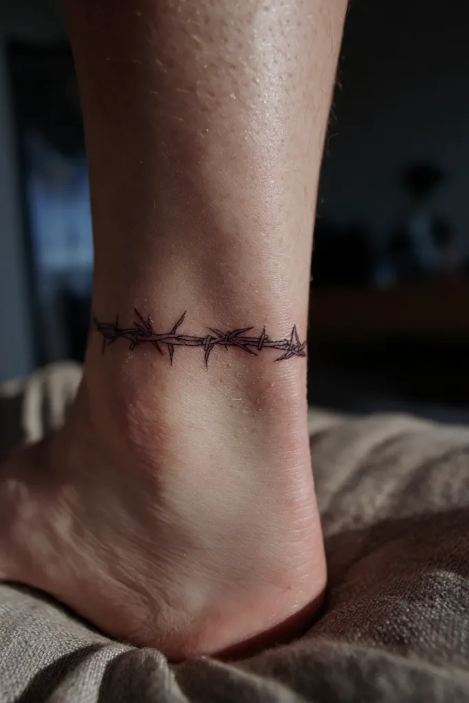 Wrapped gently around the ankle, this tattoo features a fine line crown of thorns designed like a soft band. The lines are thin and precise, with just enough detail to show the shape without feeling harsh. The placement hugs the ankle beautifully, giving it a subtle jewelry like effect. Its slim size keeps the design elegant and easy to wear.