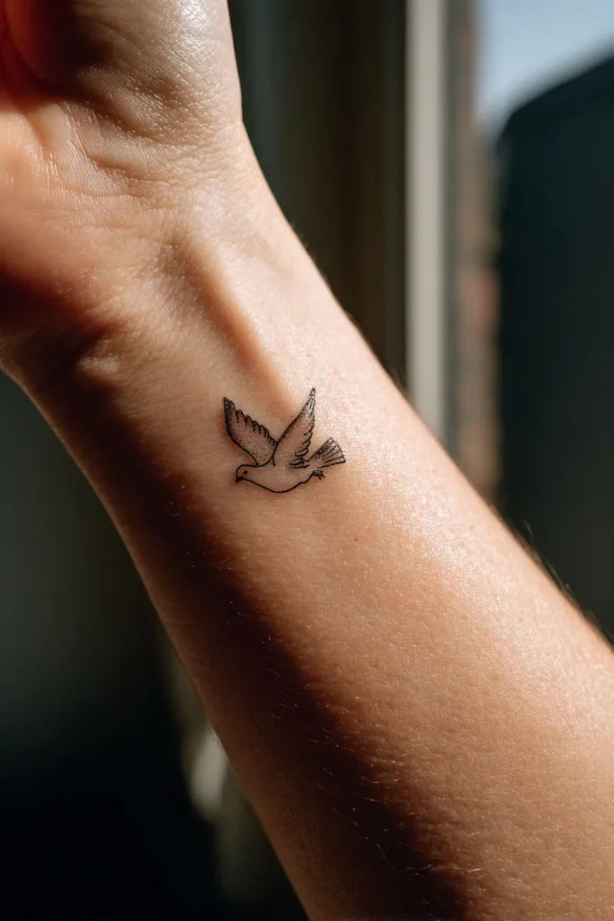This delicate tattoo sits softly along the inner forearm and features a fine line dove in mid flight with subtle script tucked into the design. The lines are light and airy with minimal shading which keeps the overall look calm and refined. Its small to medium size makes it feel intimate and personal rather than bold or overpowering.
