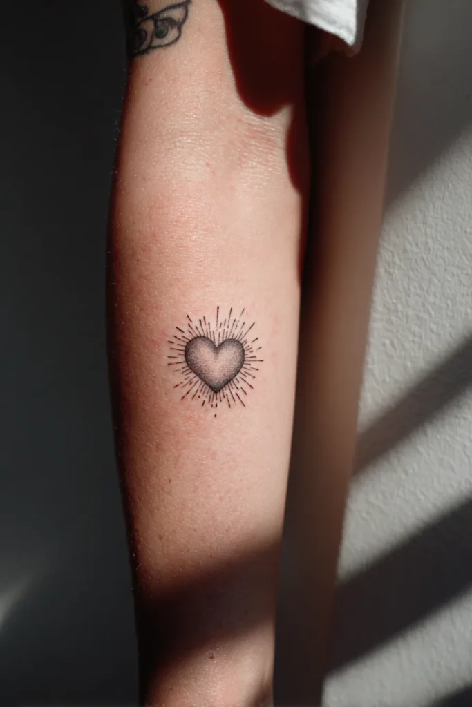 Placed just above the elbow this tattoo shows a small heart surrounded by fine line rays that give it a glowing almost sacred look. The linework is delicate and evenly spaced creating a soft radiance rather than anything bold or dramatic. Its medium small size keeps it graceful while still catching the eye.