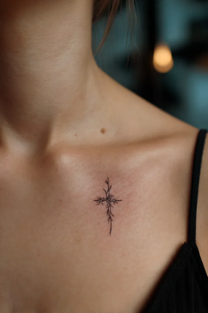 This tattoo rests beautifully near the collarbone and combines a tiny fine line cross with a short flowing scripture. The lettering is soft and elegant and the design stays close to the skin without heavy ink or harsh contrast. Its small size and subtle placement make it feel graceful and understated.