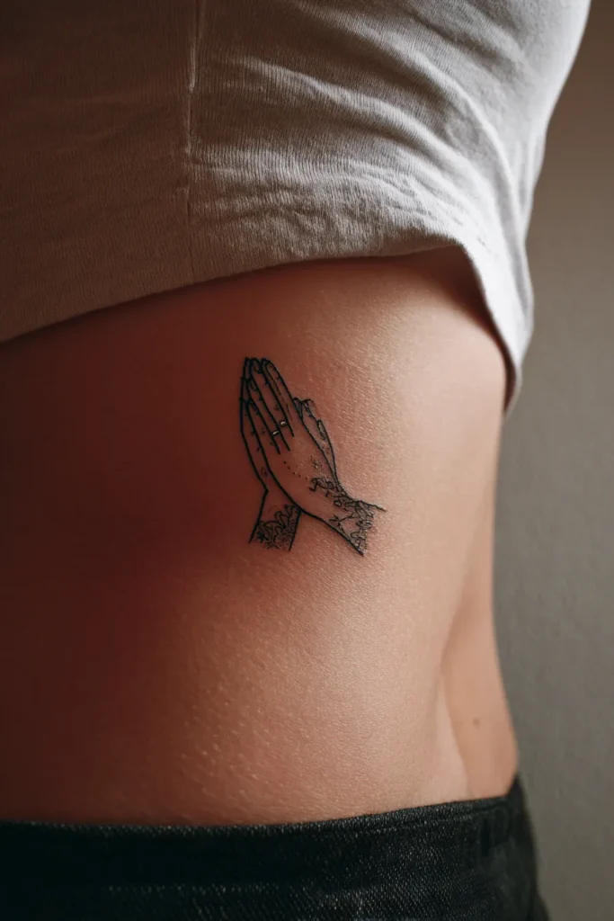 This tattoo is placed along the side of the rib area and features fine line praying hands in a gentle relaxed pose. The design is clean and minimal with smooth outlines and no heavy shading. Its size is modest which makes it feel intimate and softly sacred.