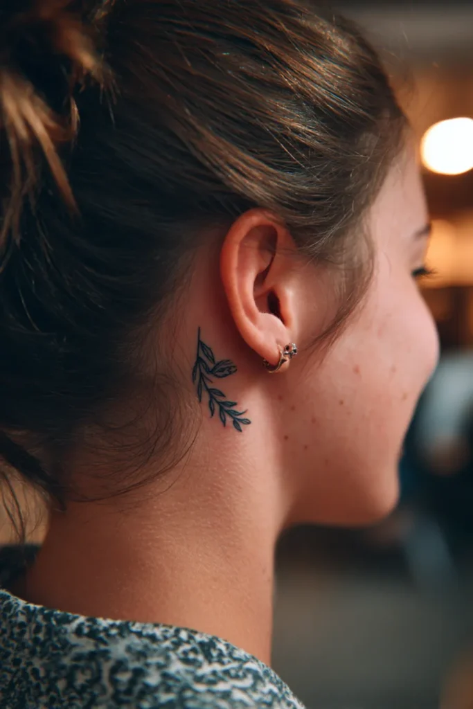 This tattoo sits just behind the ear and features a tiny botanical leaf drawn in a soft fine line style. The details are minimal with gentle curves that follow the natural shape of the area. Its small size and discreet placement make it feel light and effortless.