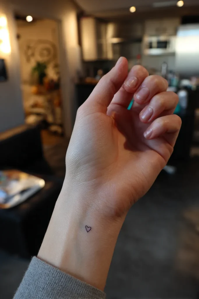 This tattoo sits delicately on the inner wrist and features a very small fine line heart drawn with clean simple lines. The size is minimal and the placement feels intentional almost like a quiet mark just for the wearer. There is no shading or extra detail which keeps the design soft and subtle against the skin.