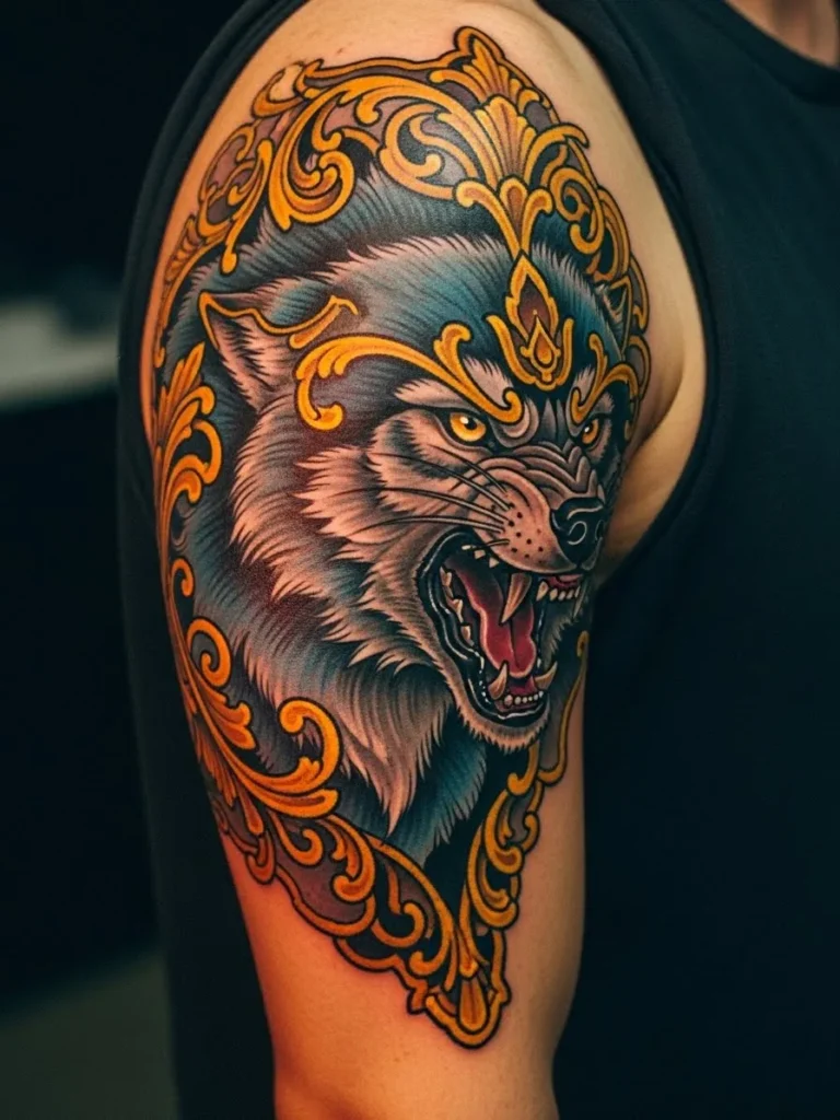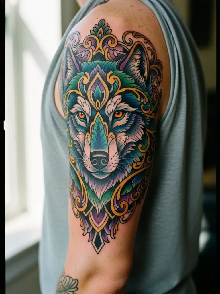This half sleeve tattoo features a bold neo traditional wolf motif that wraps beautifully over the upper arm and shoulder. The design blends sharp facial details with ornate filigree shapes in turquoise, gold and deep violet. The size fills the entire shoulder cap and flows down the arm in a tall vertical pattern that feels regal and fierce at the same time. Rich saturated colors and clean linework give the wolf an expressive presence that feels both artistic and powerful.