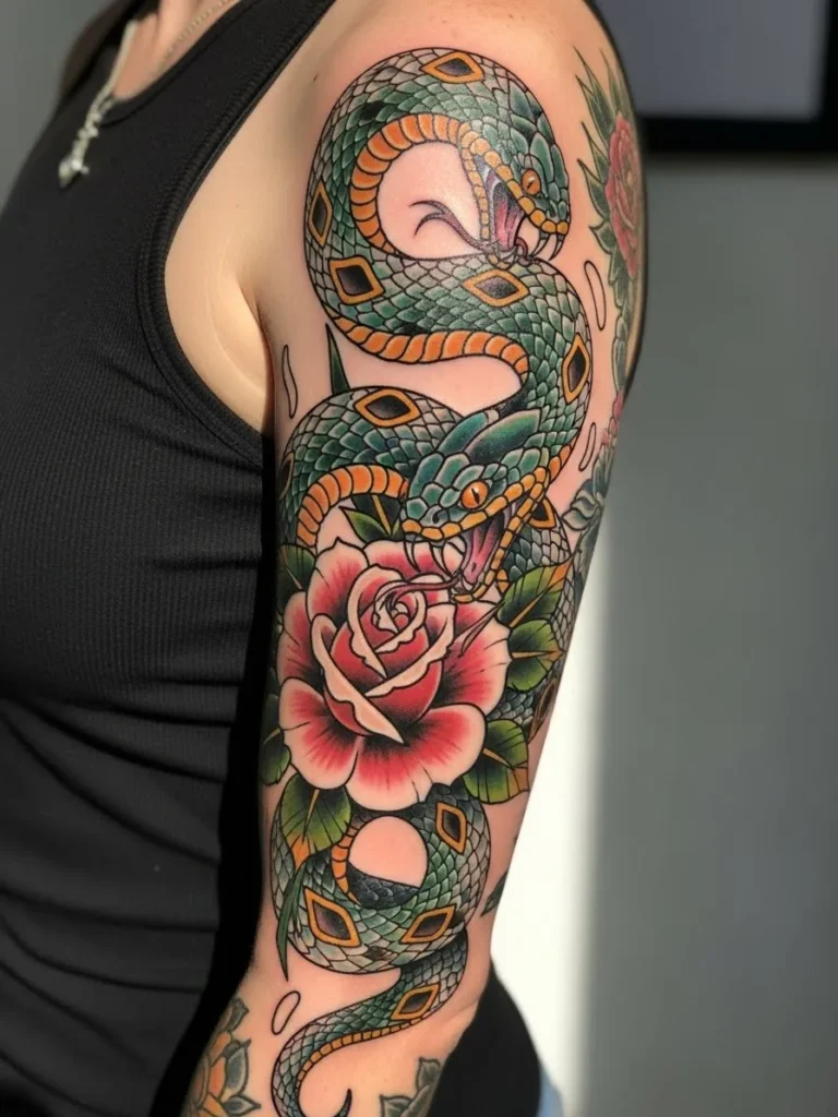 This half sleeve tattoo wraps a long green serpent around a soft red rose on the upper arm. The snake has bright orange diamond markings that pop beautifully against the deep green scales. The rose blooms right in the center with soft shading that blends pink into crimson petals. The snake’s curved body creates stunning movement through the piece and fills the arm in a graceful S shape.