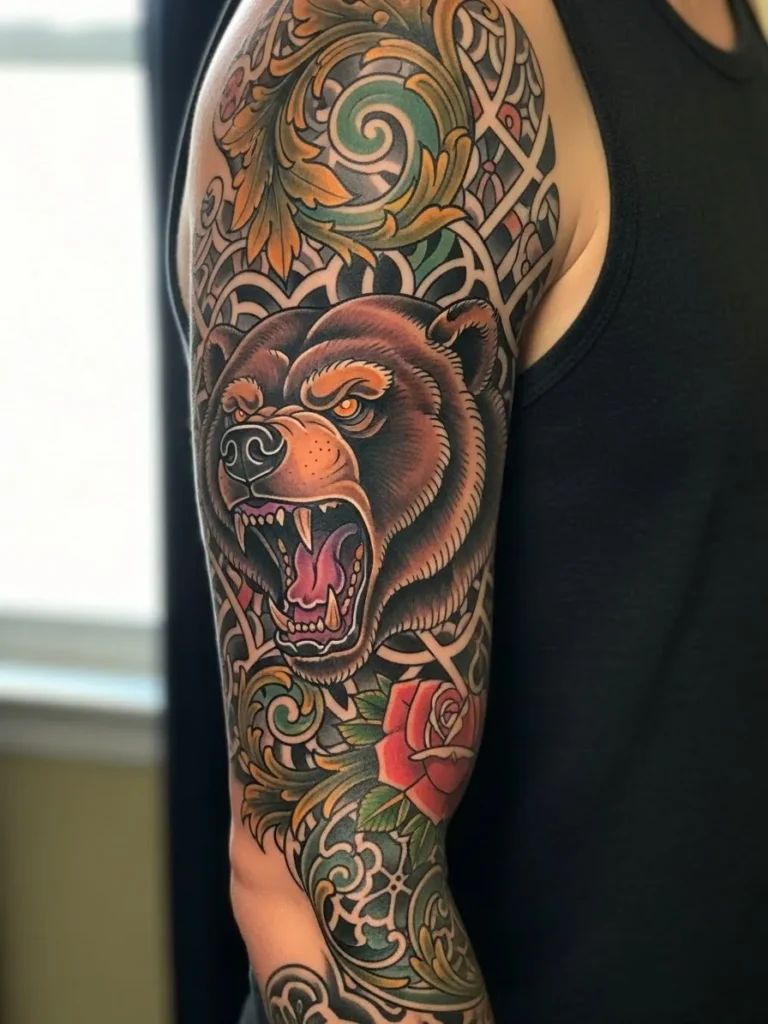 This half sleeve tattoo features a roaring bear surrounded by ornate swirling filigree that fills the upper arm from shoulder to elbow. The bear’s fur is shaded with warm browns that blend softly into each stroke while the open mouth adds a fierce dramatic moment. The background includes greens golds and subtle teal accents that weave through the ornate shapes. A single red rose near the bottom finishes the composition with a bold touch of color.