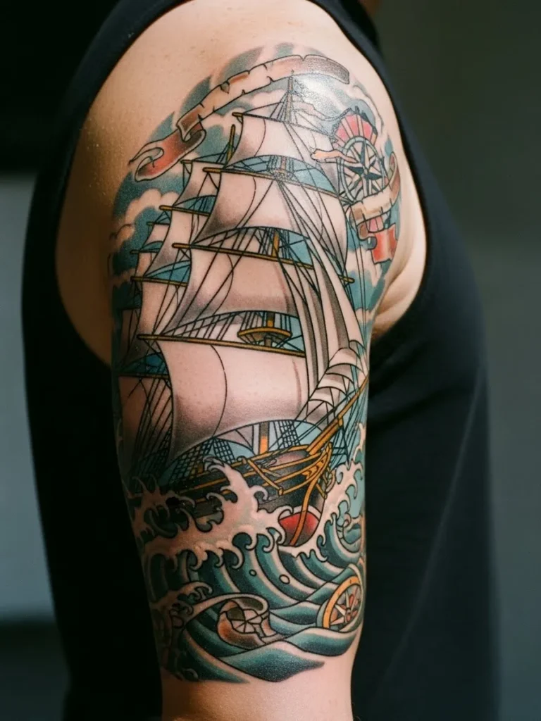 This half sleeve tattoo shows a classic tall ship riding through crashing waves with full sails catching the wind. The design stretches from the shoulder down the arm with bold neo traditional lines that give the ship structure and movement. Shades of teal blue and soft greys bring the water and clouds to life while hints of warm gold highlight the ship’s details. The whole piece feels dramatic and adventurous with swirling waves that wrap naturally around the upper arm.