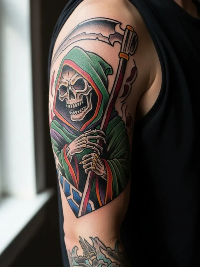 This half sleeve tattoo shows a striking neo traditional Grim Reaper in a green hooded cloak holding a curved scythe. The design sits perfectly along the upper arm with soft shading that makes the folds of the cloak look rich and dimensional. Deep reds purples and blacks outline the shadows while the bone details stay crisp and clean. The reaper’s pose feels bold but also artistic with a slightly playful expression that keeps the mood from feeling too dark.
