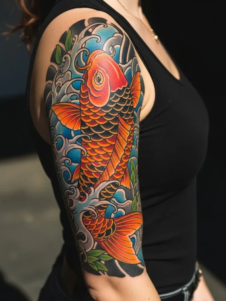 I think this design is gorgeous because it feels so full of life. The koi bring a sense of luck and growth and the water adds so much graceful movement. It is one of those tattoos that feels uplifting every time you look at it which is such a lovely quality for a half sleeve.
