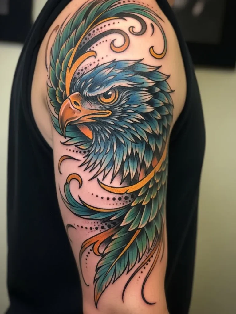 This half sleeve tattoo shows a powerful eagle sweeping across the upper arm with bold teal and gold feathers that curve in an elegant arc. The placement hugs the shoulder and creates a striking diagonal motion that makes the bird feel like it is in mid flight. The feathers are packed with detail and the linework is crisp which gives the entire piece a clean sharp look. The color palette feels rich and sophisticated with warm golds blending into cool greens and blues.