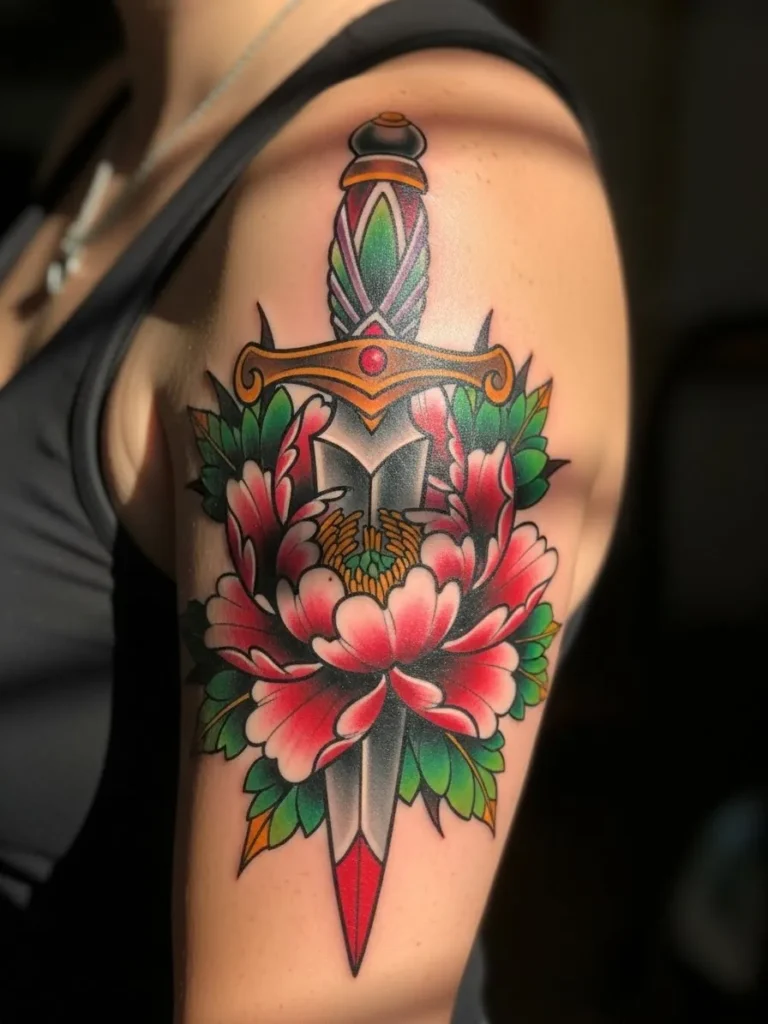 This half sleeve tattoo brings together a classic neo traditional dagger with a bold blooming peony right at the center of the upper arm. The colors are rich and saturated with soft pink petals layered around the steel grey blade. Shades of green add contrast while the bright highlight on the dagger makes it look polished and sharp. The placement hugs the upper arm perfectly and creates a balanced vertical shape that pops against the skin.