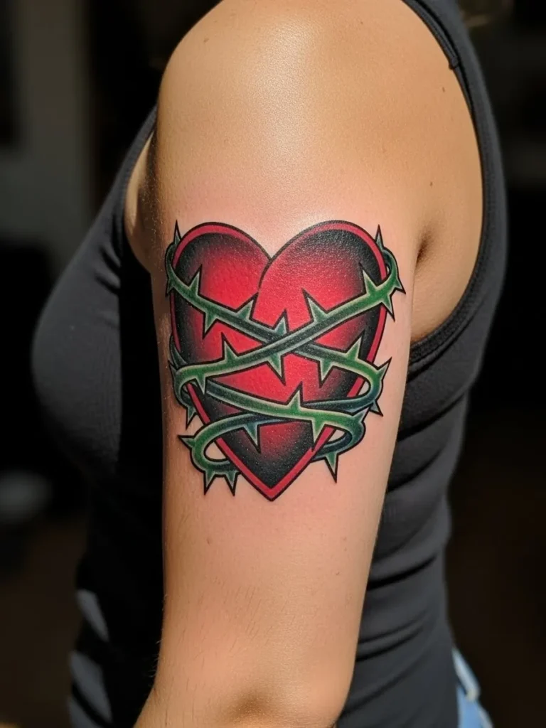 This tattoo places a bold red heart on the upper arm wrapped tightly with sharp green thorns. The shading moves from deep crimson to soft highlights which makes the heart look glossy and dimensional. The thorns wrap around it in a striking X shape and the clean thick linework makes the design pop. The placement keeps it centered and compact while still feeling strong and meaningful.