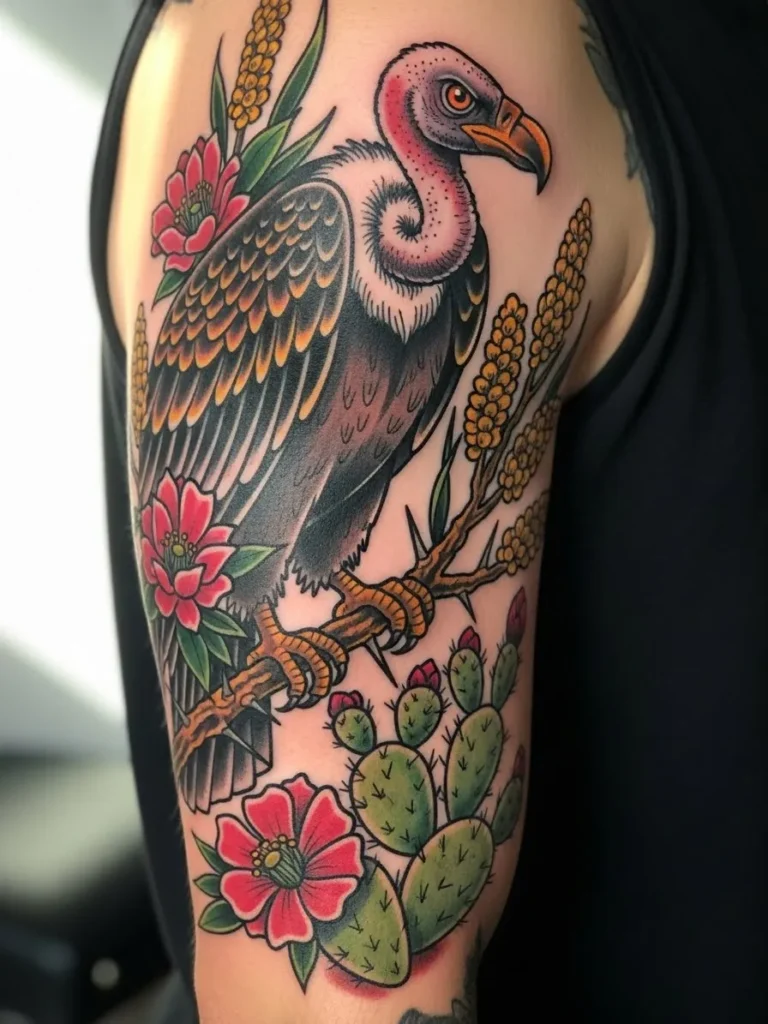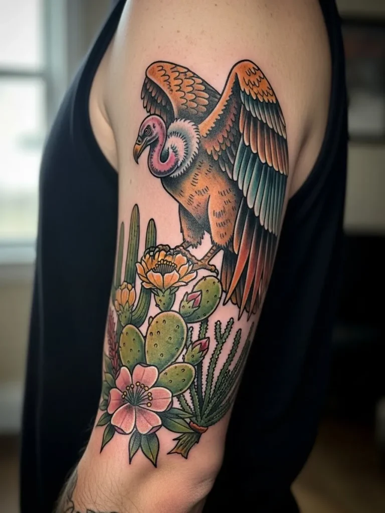 This half sleeve tattoo shows a vulture perched above a cluster of blooming desert plants. The bird’s wings blend warm browns oranges and cool teal accents while its pink neck adds a softer pop of color. Below it sits a mix of cacti and flowers with greens yellows and pinks bringing the scene to life. The placement covers the upper arm in a tall balanced composition that feels both earthy and dramatic.