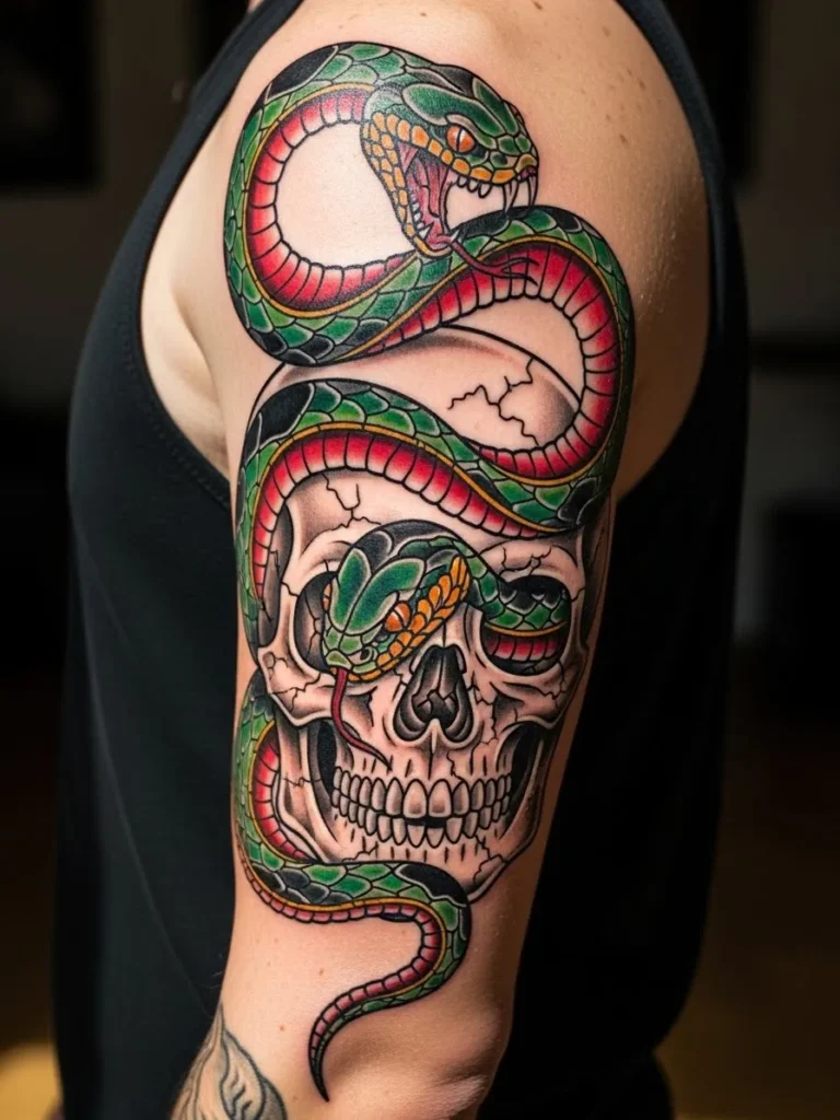 This half sleeve tattoo shows a menacing green and red serpent winding through the eye socket of a cracked skull. The colors are bright and bold with rich greens and fiery reds blending through each scale. The skull sits at the center with deep shading that makes the cracks stand out. The placement wraps the upper arm beautifully and the long curves of the snake add motion to the whole piece.
