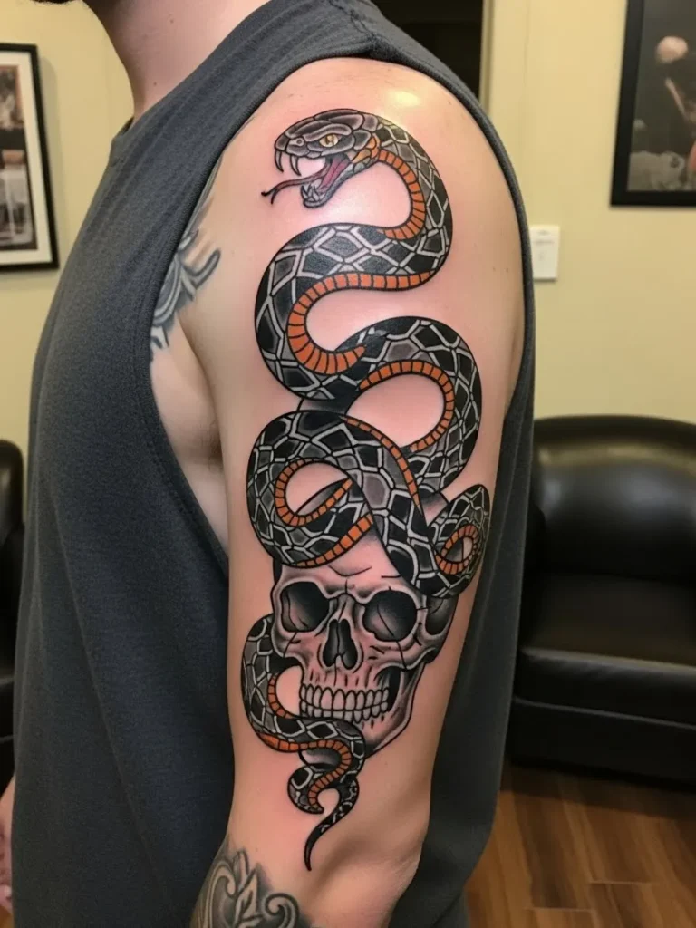 This neo traditional half sleeve features a dramatic coiled snake weaving through a grinning skull. The placement starts at the shoulder and wraps down the arm in one long winding shape. The snake patterns use warm orange bands mixed with cool grey scales and the skull is shaded with bold black that makes the design stand out sharply. Everything is outlined with clean traditional linework that keeps the whole piece crisp and striking.