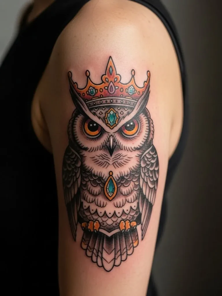 I love how charming this owl feels. It has this wise and slightly sassy vibe that makes the crown feel perfectly deserved. The little pops of gemstone color add just enough sparkle and the overall look feels elegant with a cute twist. It is the kind of tattoo that makes you smile every time you look at it.